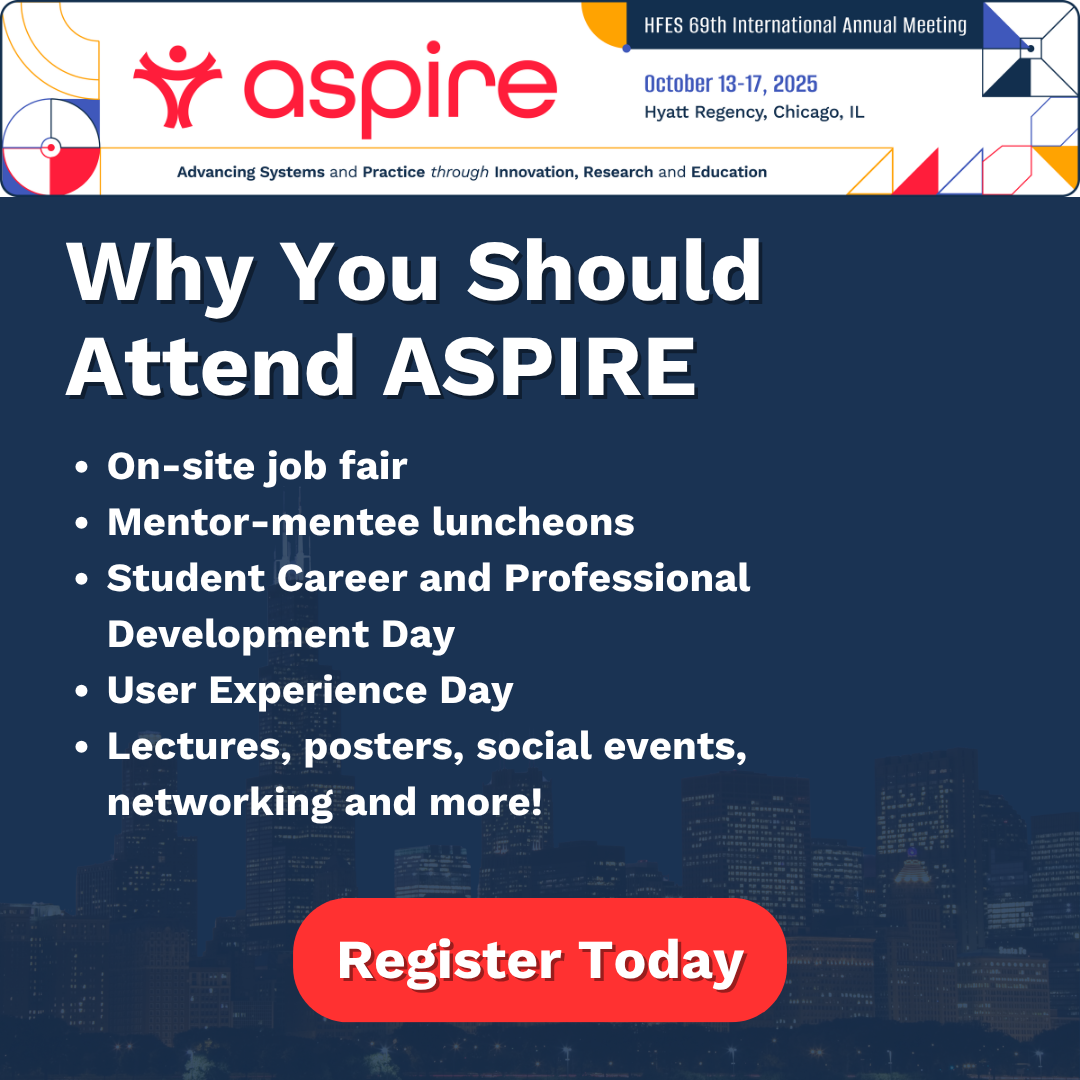 - New to HFES? You won’t want to miss ASPIRE—the 69th HFES International Annual Meeting! It’s where the brightest minds in human factors and ergonomics come together to break new ground, connect, and shape the systems that shape our world. Let’s make a difference together. Don’t miss it: https://www.hfes.org/Events/ASPIRE-International-Annual-Meeting/Registration/Register-to-Attend